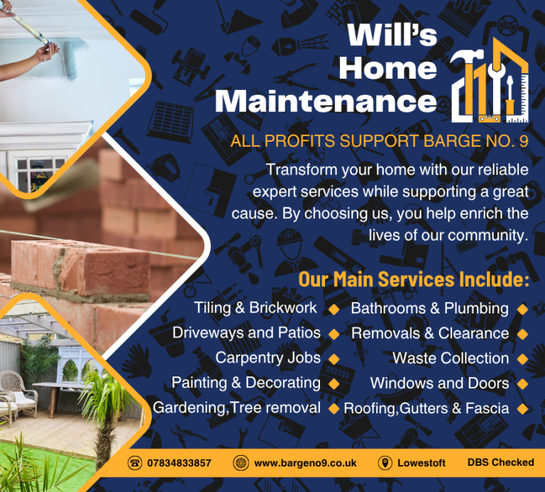 Will's Home Maintenance, a professional service dedicated to enhancing your home while supporting our community initiatives. The profits from Will's Home Maintenance serve as our primary funding source, raising approximately £100,000 to date for Barge No. 9!