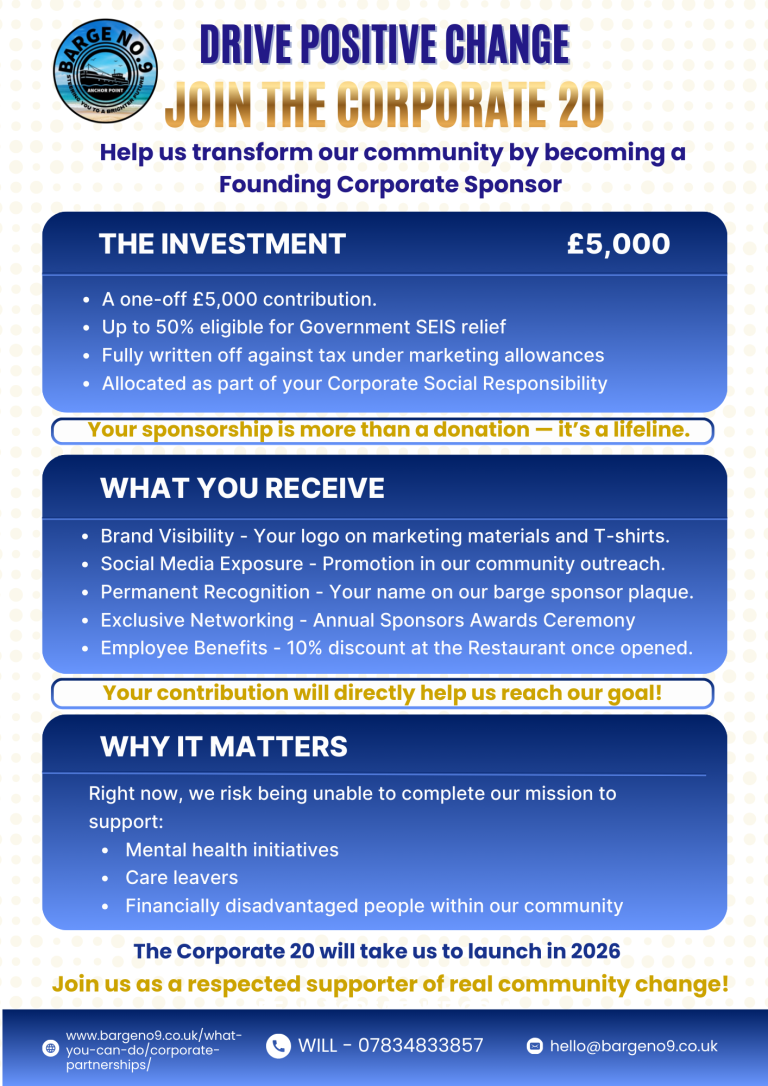 Partnering with the Barge No. 9 CIC offers an opportunity to make a meaningful impact in the Lowestoft community. By sponsoring our initiative, you will contribute to creating a vibrant restaurant and event venue while supporting crucial well-being programs at Anchor Point House. Importantly, once operational, the barge as a restaurant will generate profits that will fund community well-being and personal development programs, provided free of charge to local residents. Your partnership not only helps preserve a piece of local history but also aligns your brand with community development and social responsibility. Disclaimer: Barge No.9 itself is privately owned by William Gilroy.